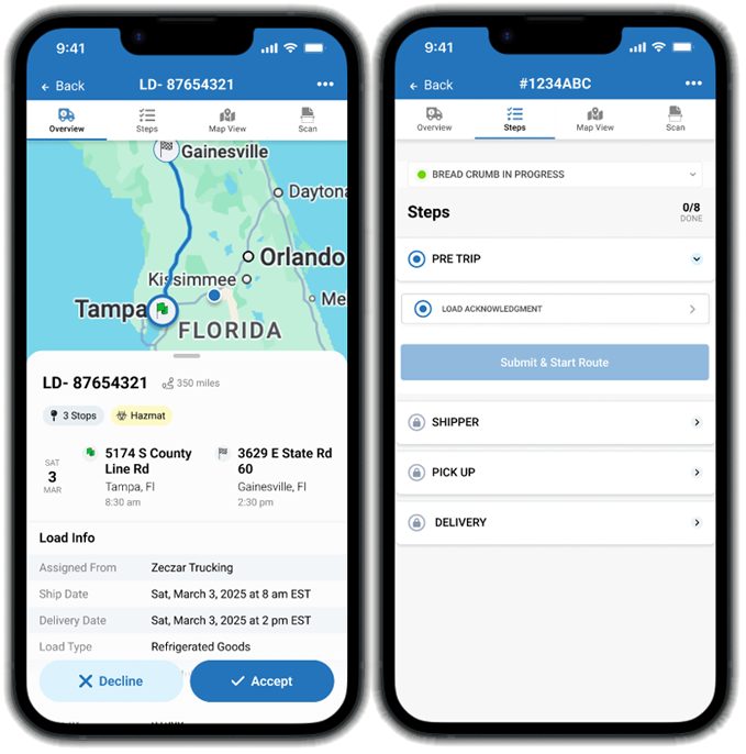 Example: In the following two example screens from the Transflo Loads Workflow SDK, a driver has reviewed a load offer on the Overview screen, tapped Accept, and then started to complete the required tasks on the Steps screen.