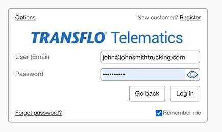 Log in to the Transflo Telematics web portal with the same credentials you use to log in to your existing Transflo applications.