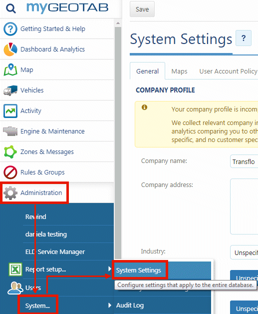 - In the Transflo Telematics web portal or myGeotab portal, navigate through the Administration and System menu selections and click System Settings.