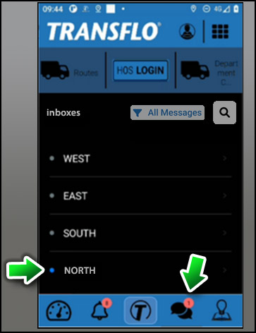 Example: A fleet admin has set up four (4) inboxes for carrier Fleet 3. They clicked East and started a new chat message that will go to all drivers in the East group who will receive the chat message in their East inbox.
