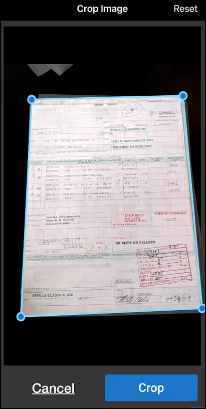 The app auto-detects borders. You can drag the blue dots to adjust the parts of the page that are IN and OUT of the crop zone. Tap Reset to undo your changes and start over with the default page edges detected by the app. To go back, tap Cancel. To keep your cropped page, tap Crop.