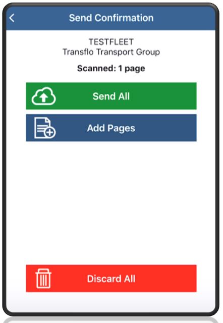 The Send Confirmation screen appears. You can add more pages, delete images, or send all the scanned document images in the batch for the load.