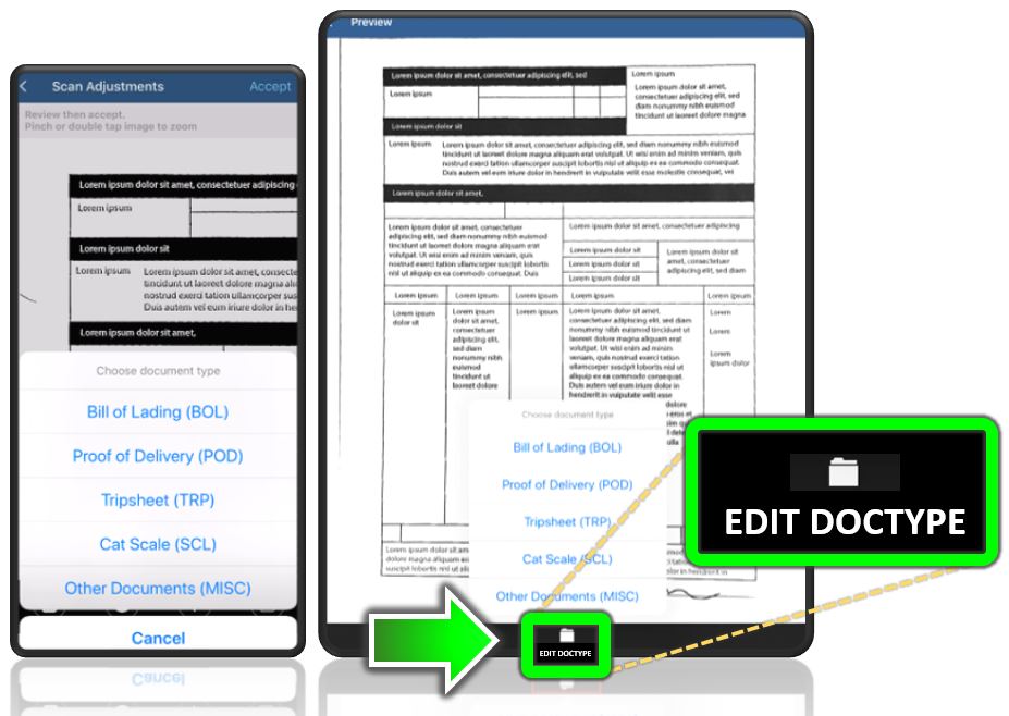 To change the document type, select a document on the Scan Documents screen and tap EDIT DOCTYPE at the bottom of the screen.