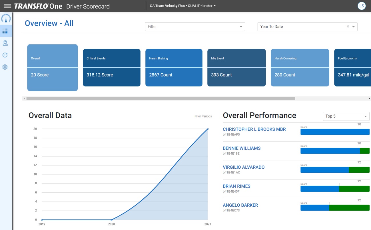 Use the Driver Scorecard in Transflo One Portal to view an overall calculated score and the following metrics for each driver: