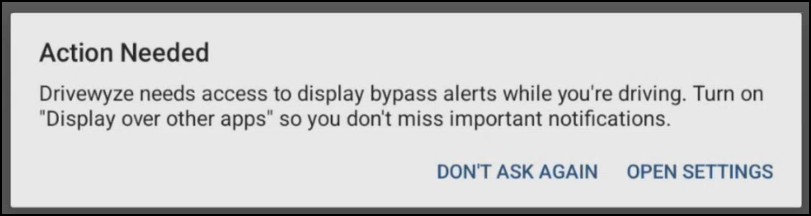 Drivewyze needs access to display bypass alerts when you're driving. Turn ON the Drivewyze Display Over Other Apps setting so that you do not miss important notifications.