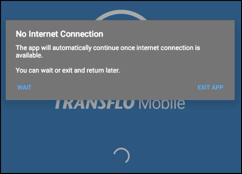 If you tapped WAIT in a previous No Internet Connection message and Transflo Mobile+ still cannot detect your network connection, the following message might appear: