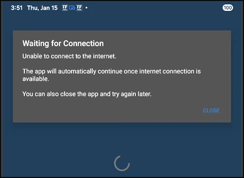 Unable to connect to the internet. The app will automatically continue when an internet connection is available.