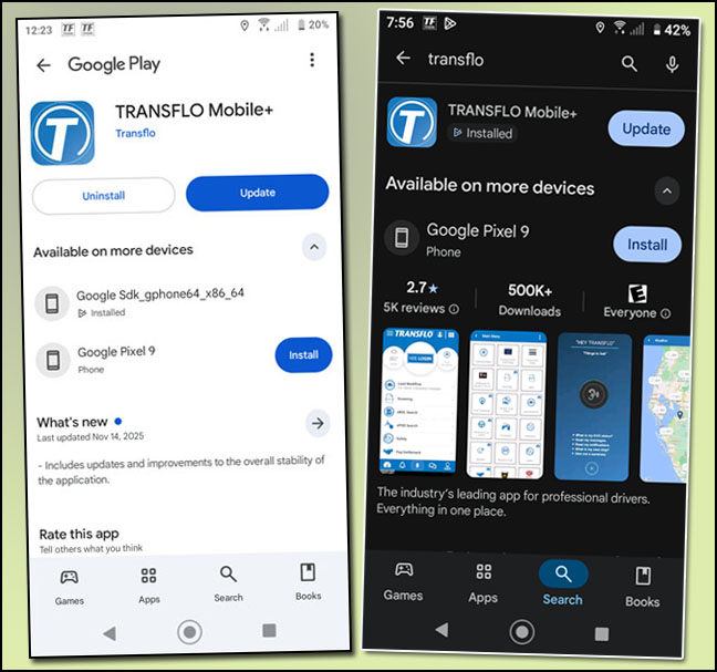 The last step brings you to the Google Play store where you have the option of tapping Update or tapping the Transflo Mobile+ entry to get more info.