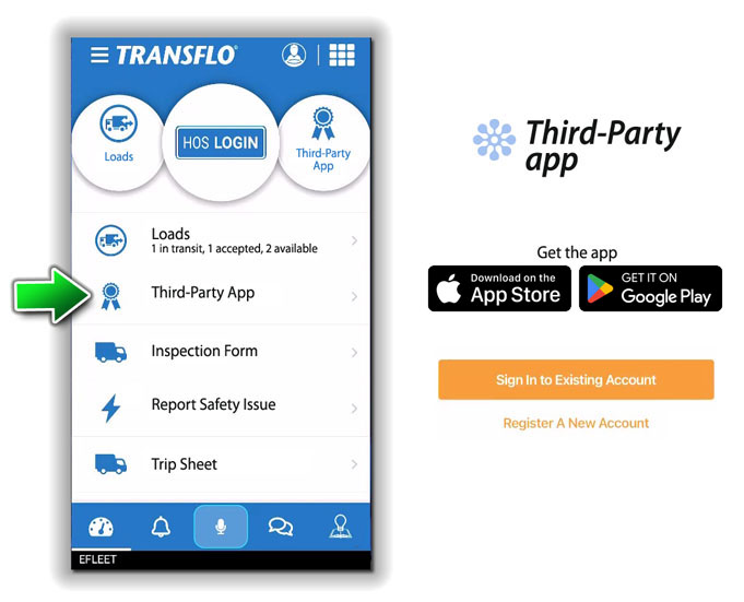 To help make the experience easier for drivers, the Transflo Mobile+ app can pass the current driver ID, fleet ID, first name, and last name to pre-configured third-party apps. For example, a driver can tap a menu item in Transflo Mobile+ to go to another app without having to sign in.