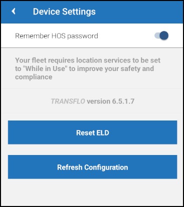 Tap Reset ELD or Refresh Configuration. Try just one option and see if that works for you. If not, repeat these steps later and try the other option. Try both options. Try logging out and logging back in again. Make a note of what works best for you. These options sometimes vary based on your device, mobile OS, app release version, ELD configuration, network access, and other system properties.