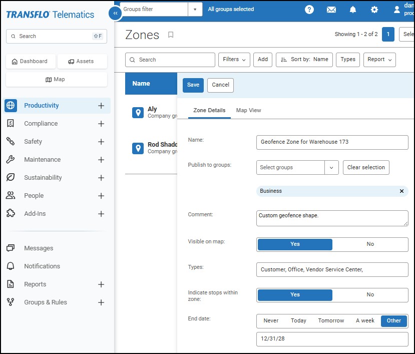 As a fleet manager or loads workflow designer, you can use Transflo Telematics (myGeotab) to define and manage geographical fences (geofences) around your shipping locations. Based on GPS coordinates, your geofence zones help automate driver arrivals and departures and can be used for tracking, reporting, and analysis of vehicle activity. Your geofences can be circular shapes or custom polygons that you draw: