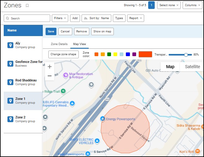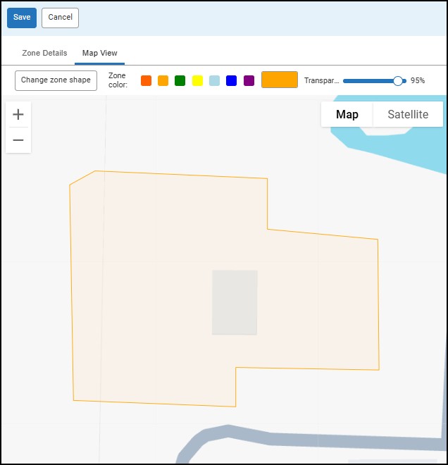 Click the Map View tab to modify the zone shape, color, and transparency. To lighten the shading, slide the transparency setting to the right (for example, 85%).