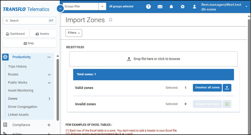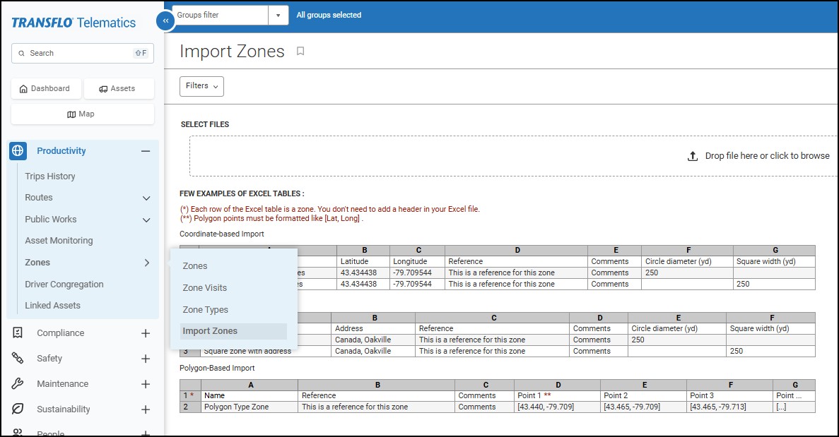 You can set up a list of zones in your TMS, a database, or a spreadsheet application and then import the list. It must conform to the required template. In Transflo Telematics or myGeotab, this method supports the following imports: