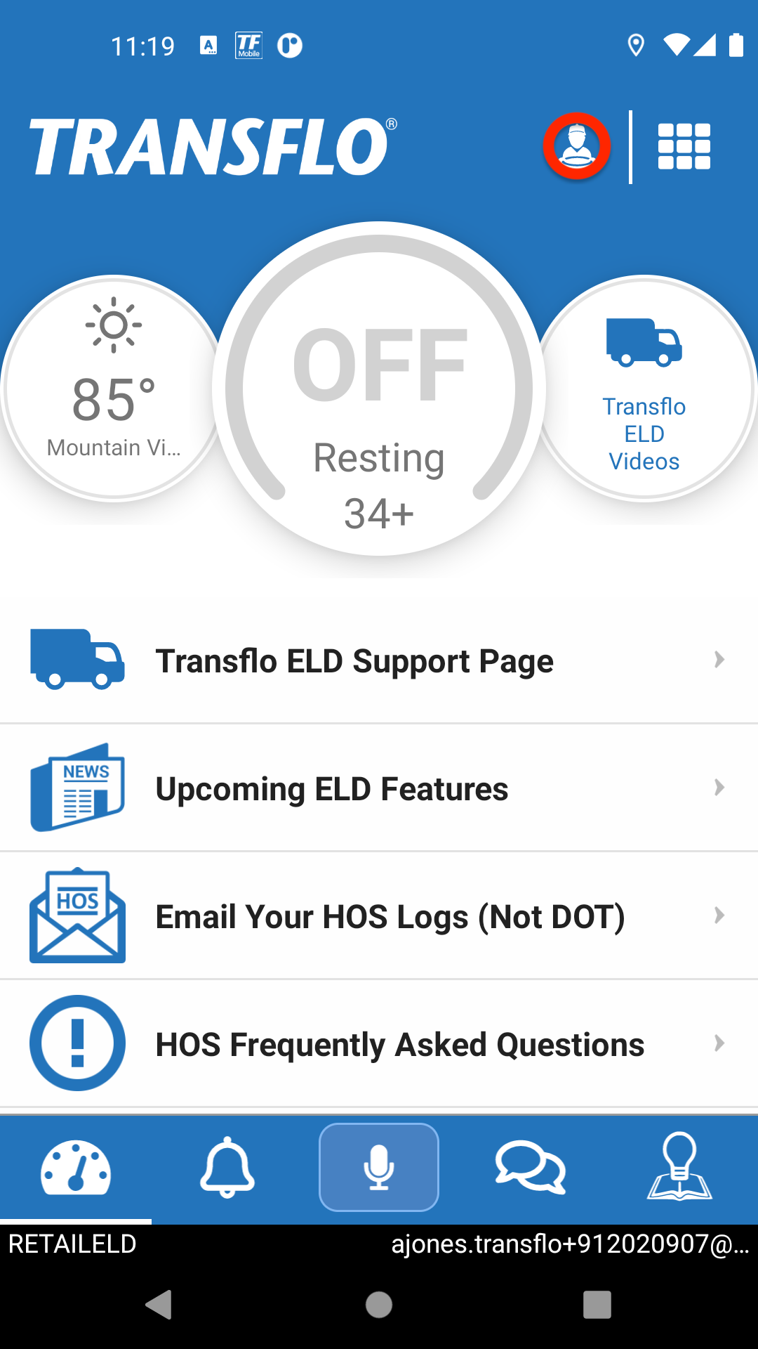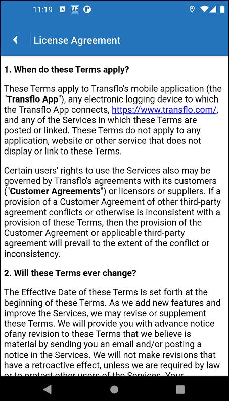Follow these steps to view the end user license agreement (EULA) for your Transflo mobile app (the steps are similar for the Transflo HOS app or the Transflo Mobile+ app).