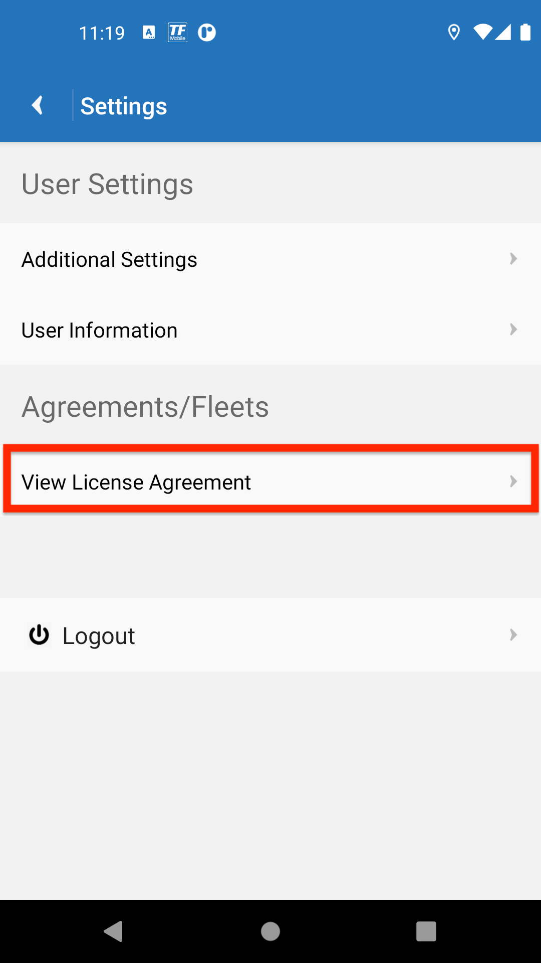 On the Settings screen, under Agreements/Fleets tap the View License Agreement tile.