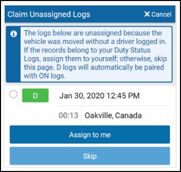 The ELD creates duty status logs even when your vehicle is driven without a user logged in. If this occurs, you are asked to review and claim the unassigned logs.