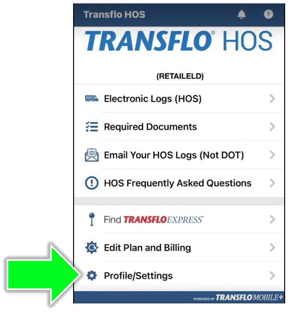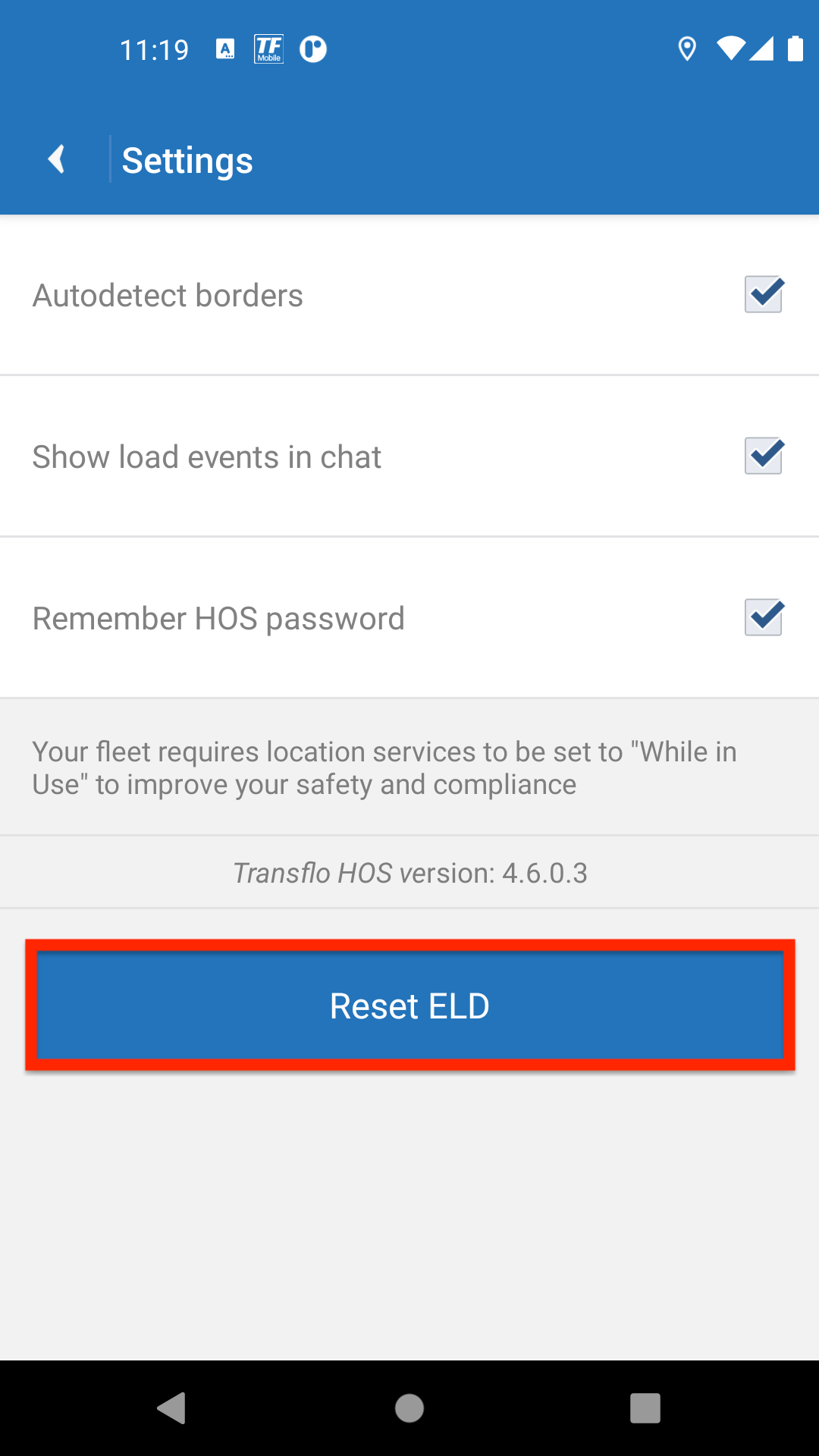 Because the Transflo Mobile Plus app can show integrated HOS app features for your ELD, you can turn the Autodetect Borders, Show Loads in Chat, and Remember HOS Password features ON or OFF. You can also reset your ELD data settings.