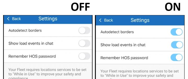 Show Load Events in Chat: This feature shows basic information about load status in your chat conversations with dispatchers and potentially other drivers. Chat and show loads are available only in the Mobile+ app; the standalone HOS app does not include these features.