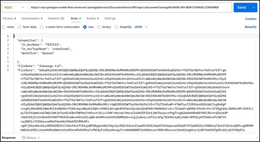 Tip: The query parameter in the request storageProfileId=<number> that selects which storage profile the image file gets stored in is optional. This query parameter can be specified whether you're using the old payload or the new payload. If not specified, the document is saved to the default active storage profile.
