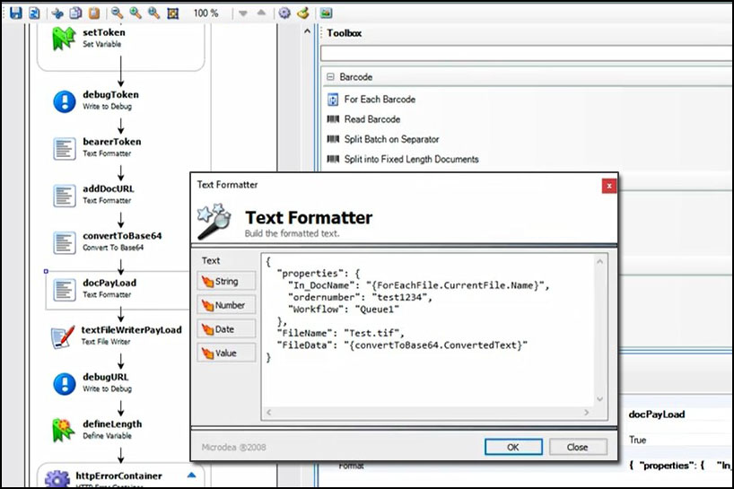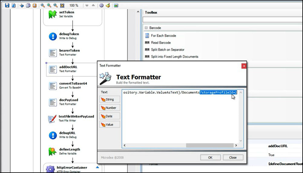 This example image shows the addDocURL text formatter in Synergize Process Designer.