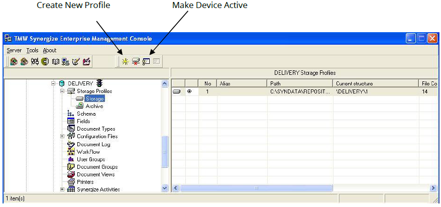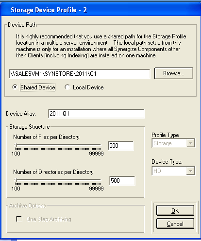 Tip: Because Synergize connects to the active storage profile device path each time a document is saved, no down time occurs when you want to change an active profile. From that point on, any documents are stored in the newly activated profile device path.