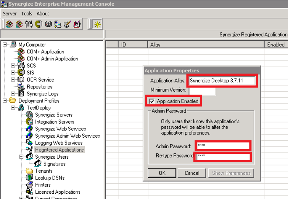 Enter the Synergize Desktop 3.7.X under Application Alias, click the Application Enabled check box and enter an Admin password. Click the OK button.