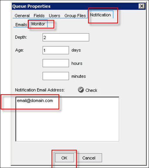In the Queue Properties window, click the Notification tab.
