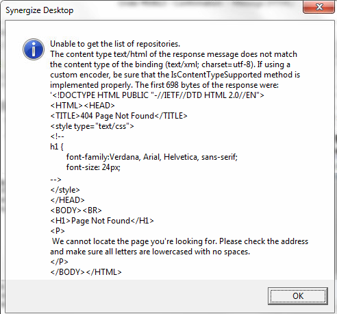 Resolve Synergize Desktop Error: Unable to get list of repositories, content type text/html of response does not match binding…