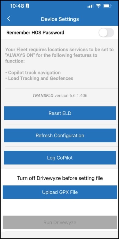 In the Transflo Mobile+ app, verify that Drivewyze is OFF.