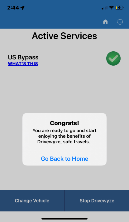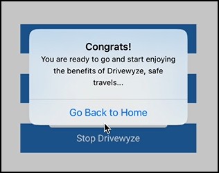 The Congrats! You are ready to go and start enjoying the benefits of Drivewyze, safe travels... message appears. Tap Go Back to Home.
