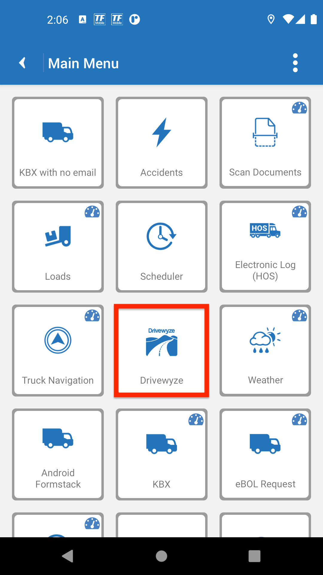 Tip: Transflo T-Series ELD users do not need to start Drivewyze; it activates automatically as part of the ELD system. If you are a fleet administrator, see Drivewyze in the Mobile Menu Admin KB to set up and configure Drivewyze.