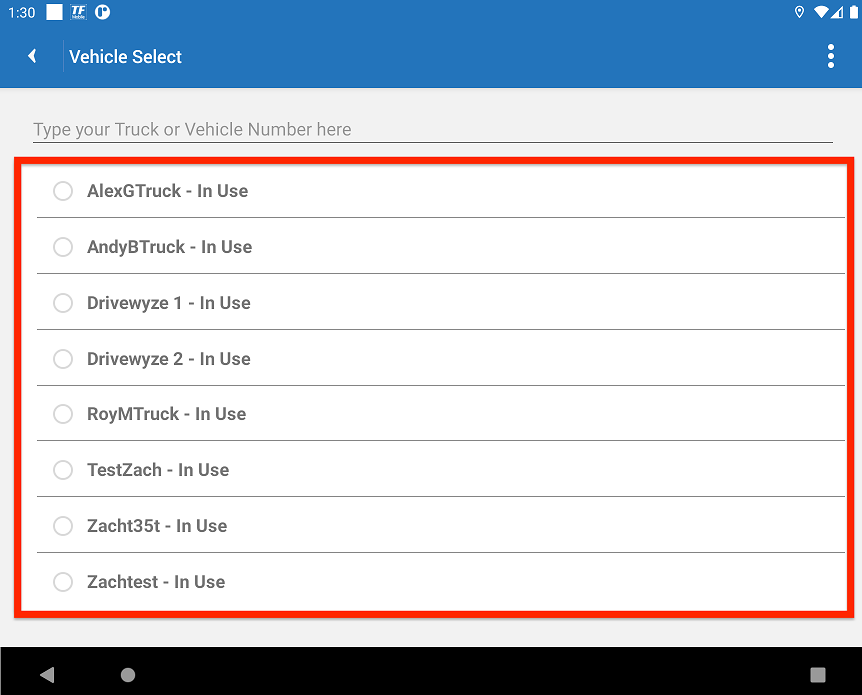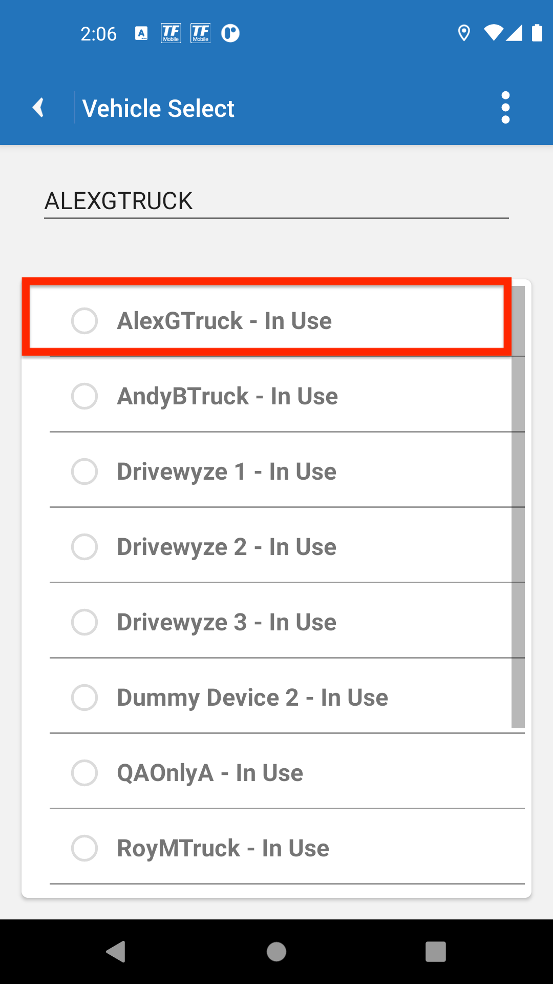On the Vehicle Select screen, in the list of available vehicles, tap the vehicle that you would like to use.
