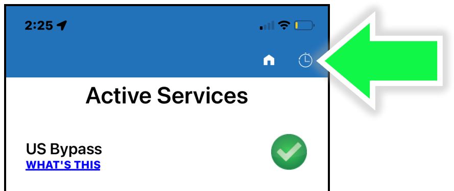 The Active Services screen shows US Bypass with a green check mark. Tap