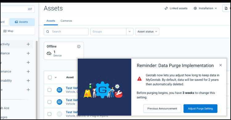By October 2025, fleet staff using MyGeotab or the Transflo Telematics branded edition of the MyGeotab portal have already received the following reminder about the 2-year limit for the data purge policy: