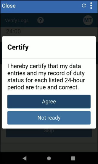 When you are ready to certify your entries, tap Agree when you see this message when you If you are not yet ready to verify your logs, tap Not ready.
