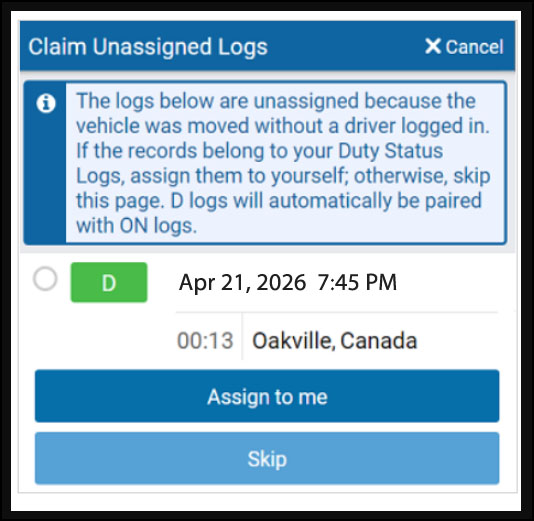 The Claim Unassigned Logs screen appears if the currently selected vehicle has been driven without a driver being logged in. These unidentified driver logs or unassigned logs cannot be edited but can be reassigned to the correct driver.