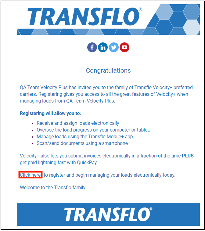In your e-mail inbox (GMail, Outlook, Yahoo, whatever you use), open the automated registration message from Transflo and click the Velocity+ registration link.