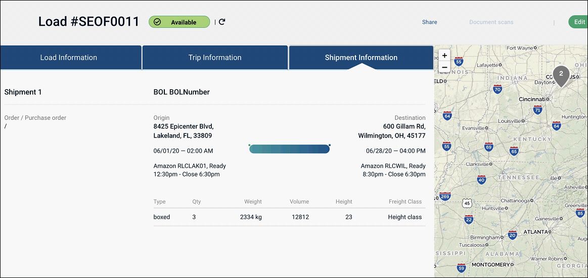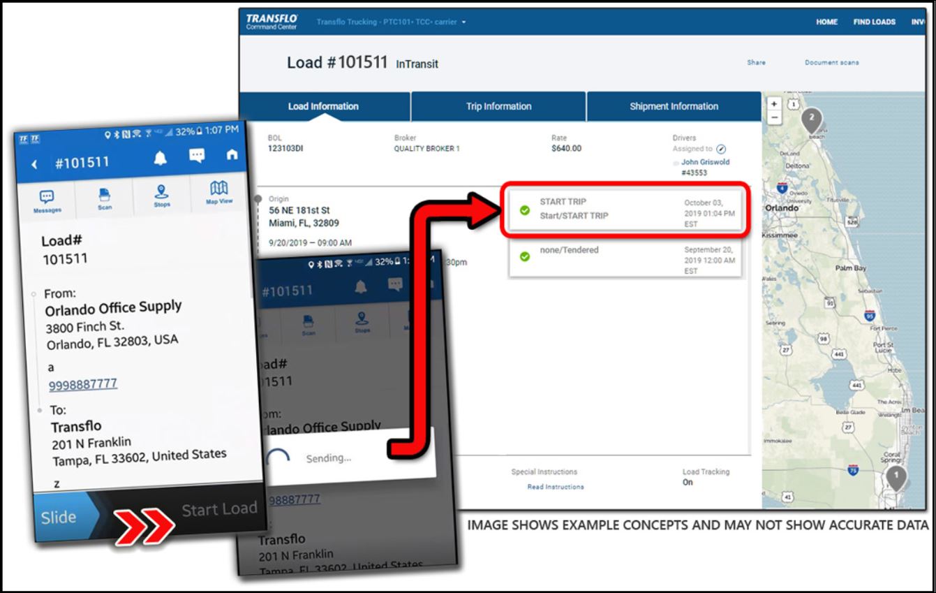 The Load Detailspage displays the BOL, Origin, Destination, and Driver. A map with pickup and drop off locations appears at right.