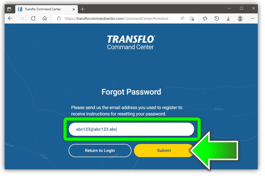 On the Forgot Password page, enter your email address. It must be the same email address that was originally used to process your Command Center registration. Click Submit.