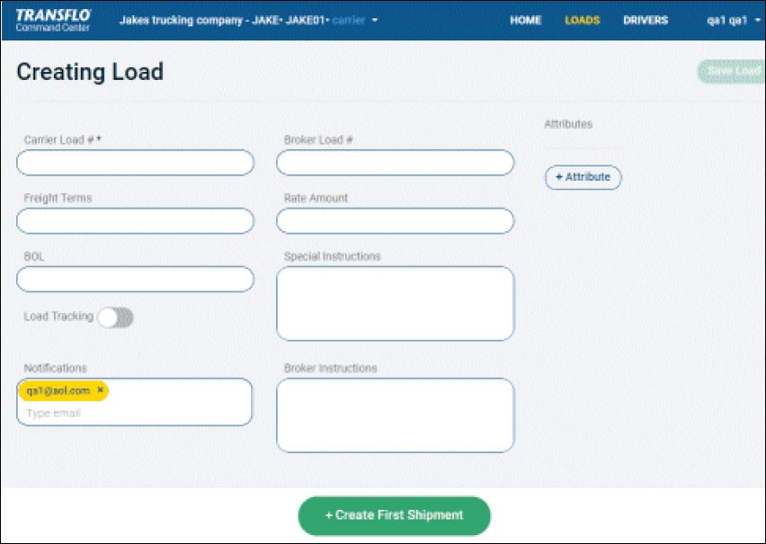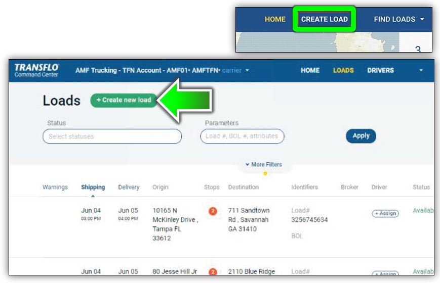 Click the + Create Load button at the top of the Loads page. In some configurations, you might have a CREATE LOAD item in the top menu bar.