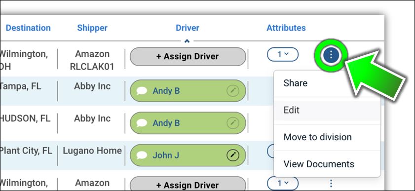 To edit an available load, click the three vertical dots at the far right of a row on the Loads page, and select Edit from the drop-down list.