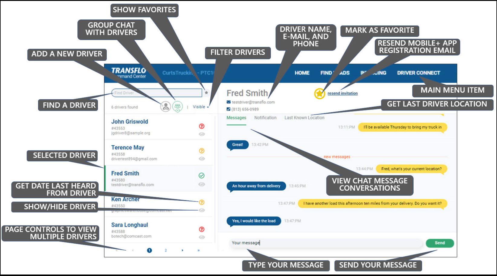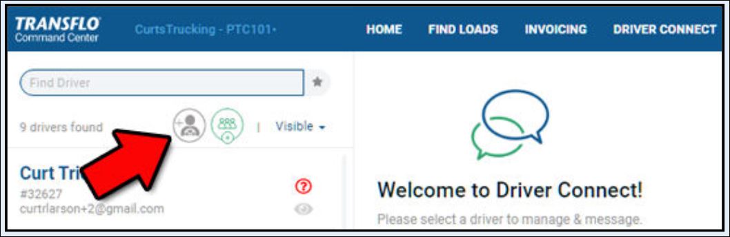 To open the Drivers page, click DRIVER CONNECT in the upper right corner of the Home page. The Drivers panel opens and provides options to send messages and notifications to a single driver or groups of drivers.