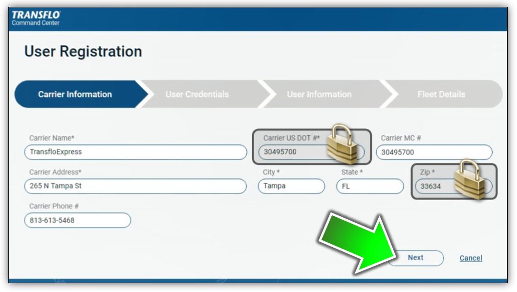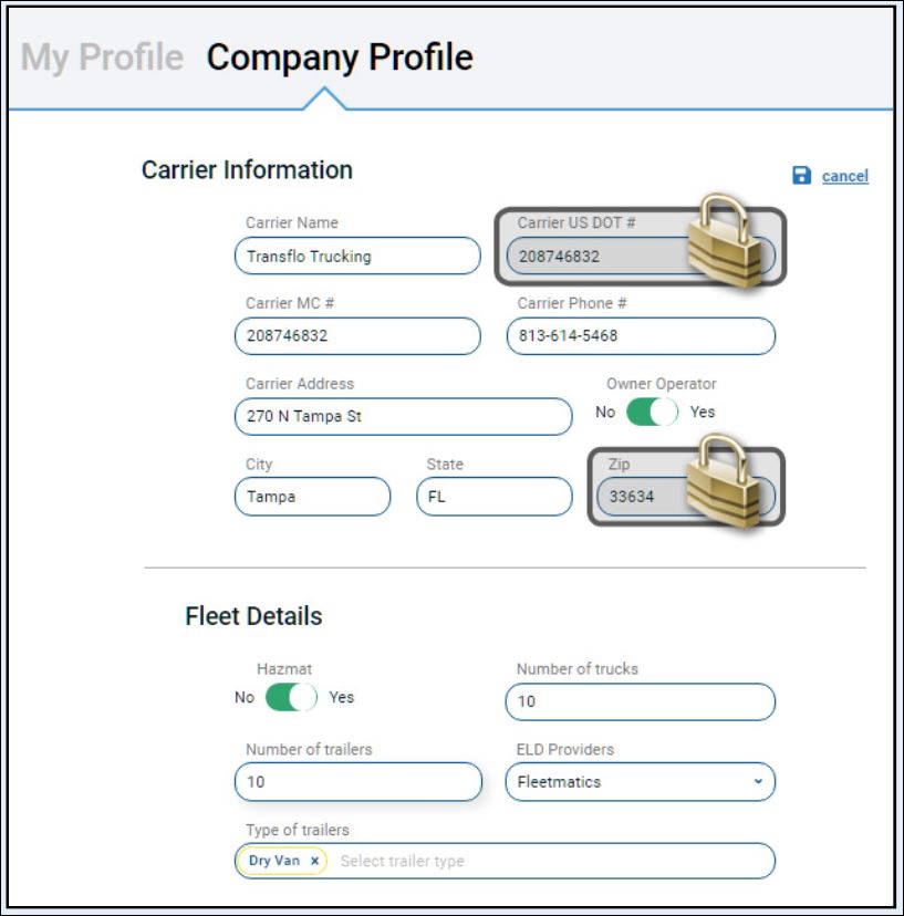 Note: Because all carrier registration data is cross-referenced with other brokers, the correct identification of carriers, company names, and DOT numbers is critical. For example, do not enter ABC Trucking if your official name is ABC Trucking Services, Inc. Enter consistent official names and numbers on record.