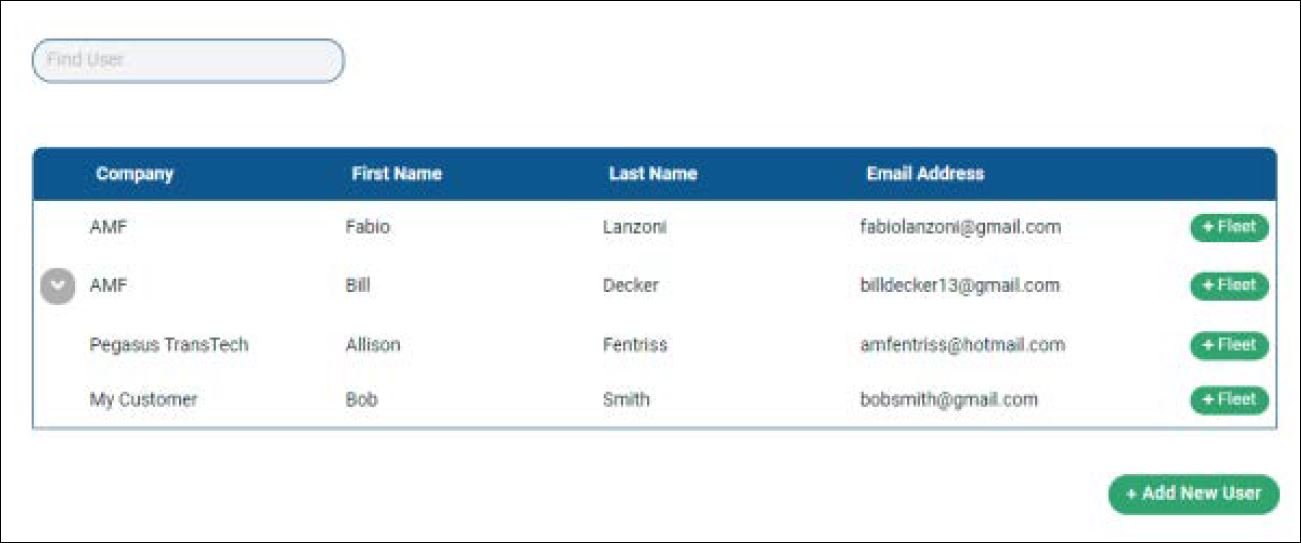 To add a new user, click the + Add New User button, enter a valid email address, and click Search to display a table of fleets. Click the + Associate User button to add the new user.