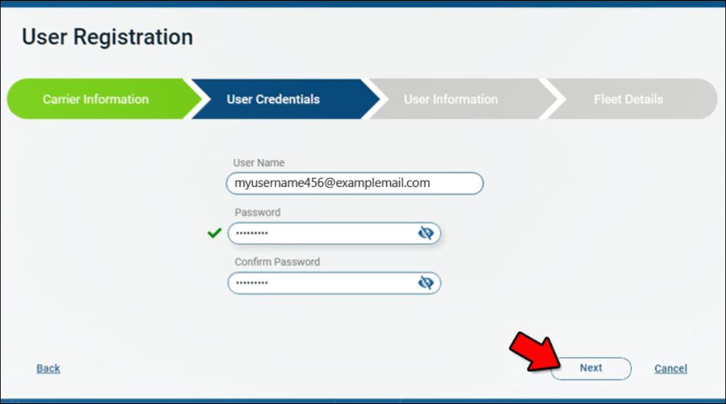 When your new password is valid and confirmed, a green check mark appears and you no longer receive alerts about passwords not matching. Click Next.