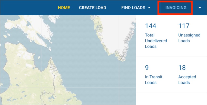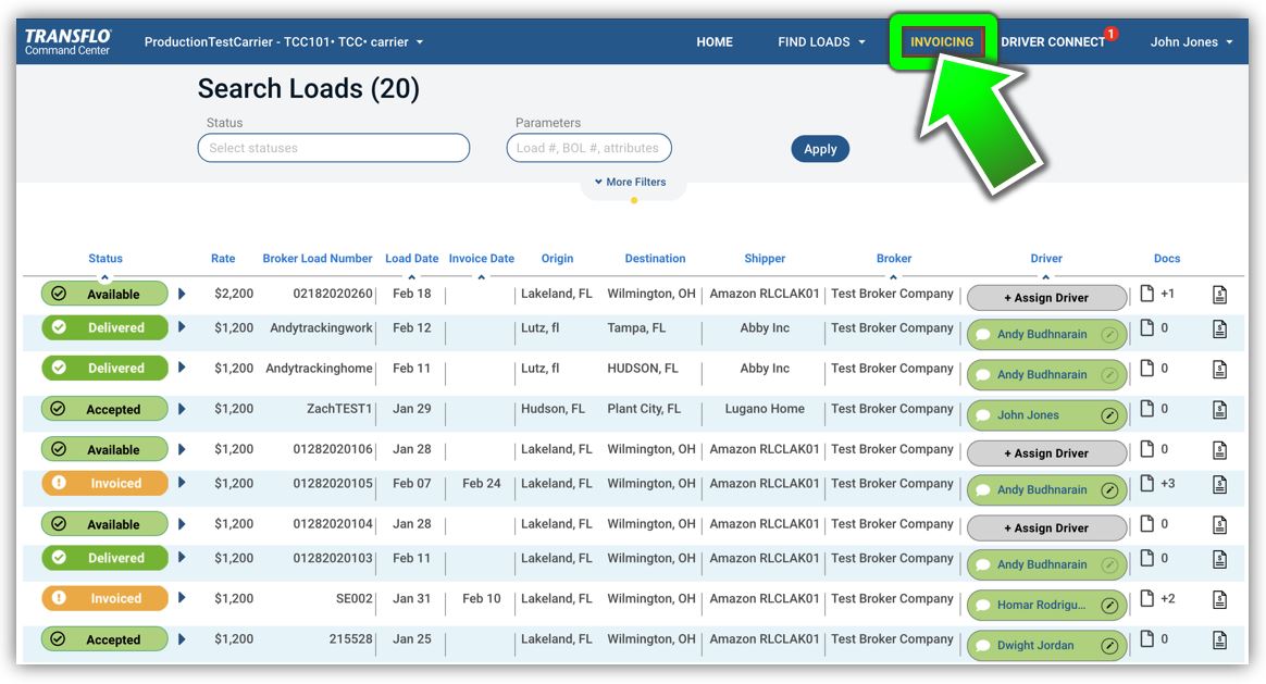 On the Invoicing page, apply one or more search filters and sort the list to find a load.