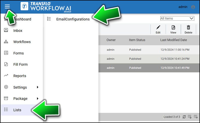 Choose Lists and then select Email Configuration.