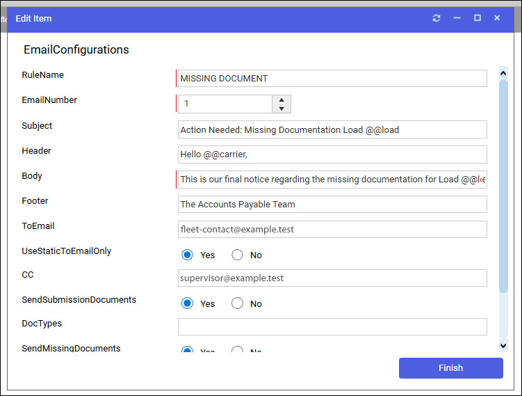 As a member of your load document, invoicing, and billing team for a trucking, shipping, or logistics broker, you can work with your administrator to configure automated e-mail alerts for MISSING DOCUMENT, INVALID STATUS, RATE MISMATCH, and other broker workflow document processing exceptions. These emails can include notifications and follow-ups after specified time intervals.